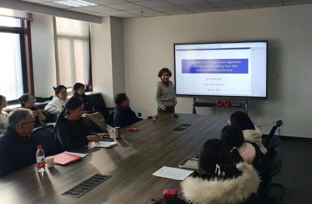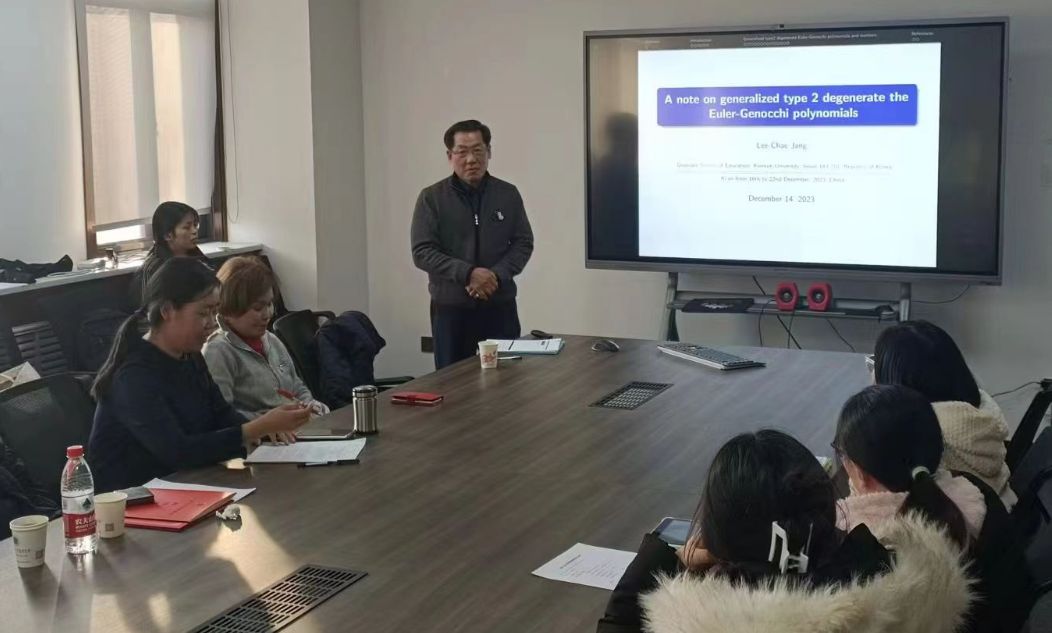 三场学术讲座依次为:Taekyun Kim教授的Probabilistic de generate bell polynomials associated with random variables(与随机变量相关的概率退化BELL多项式)、Hye Kyung Kim教授的Combinatorial properties of lambda analogues of special numbers and polynomials (λ类特殊数和特殊多项式的组合性质)、Lee-Chae Jang教授的A note on generalized type 2 degenerate the Euler-Genocchi polynomials(推广的第二类退化Euler-Genocchi多项式)。三位教授利用三场讲座,为参会教师、同学们介绍了三种不同的多项式,并与参会师生开展了交流,回答了参会师生提出的问题。